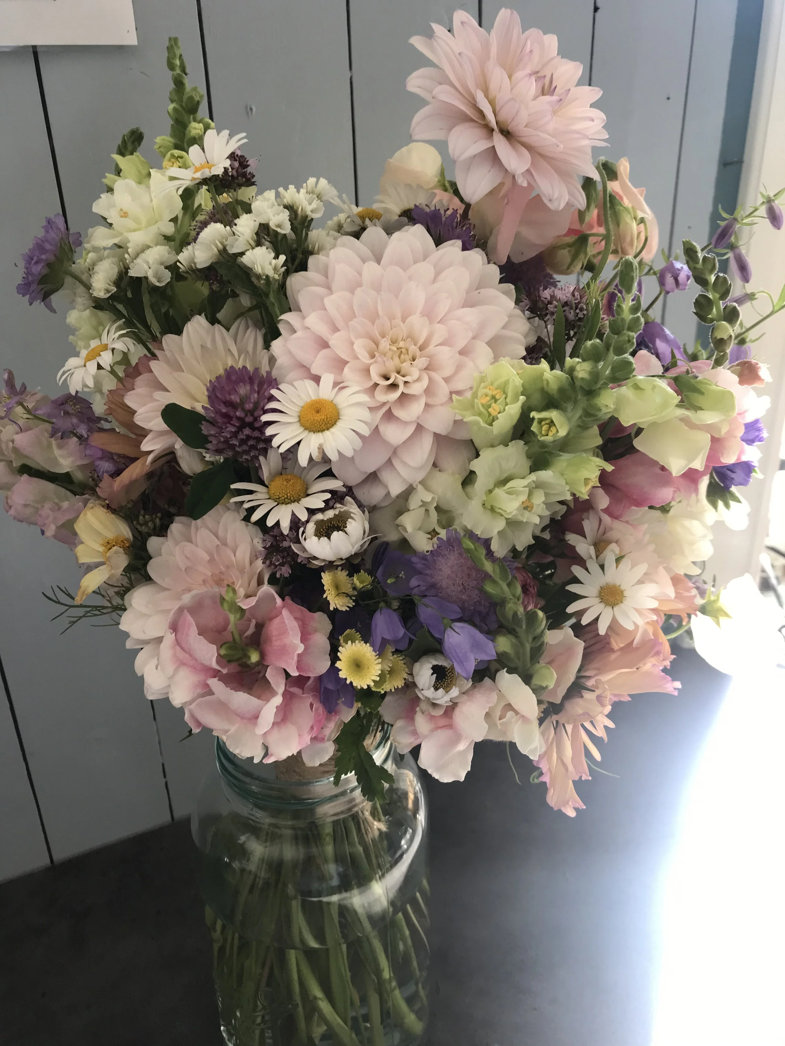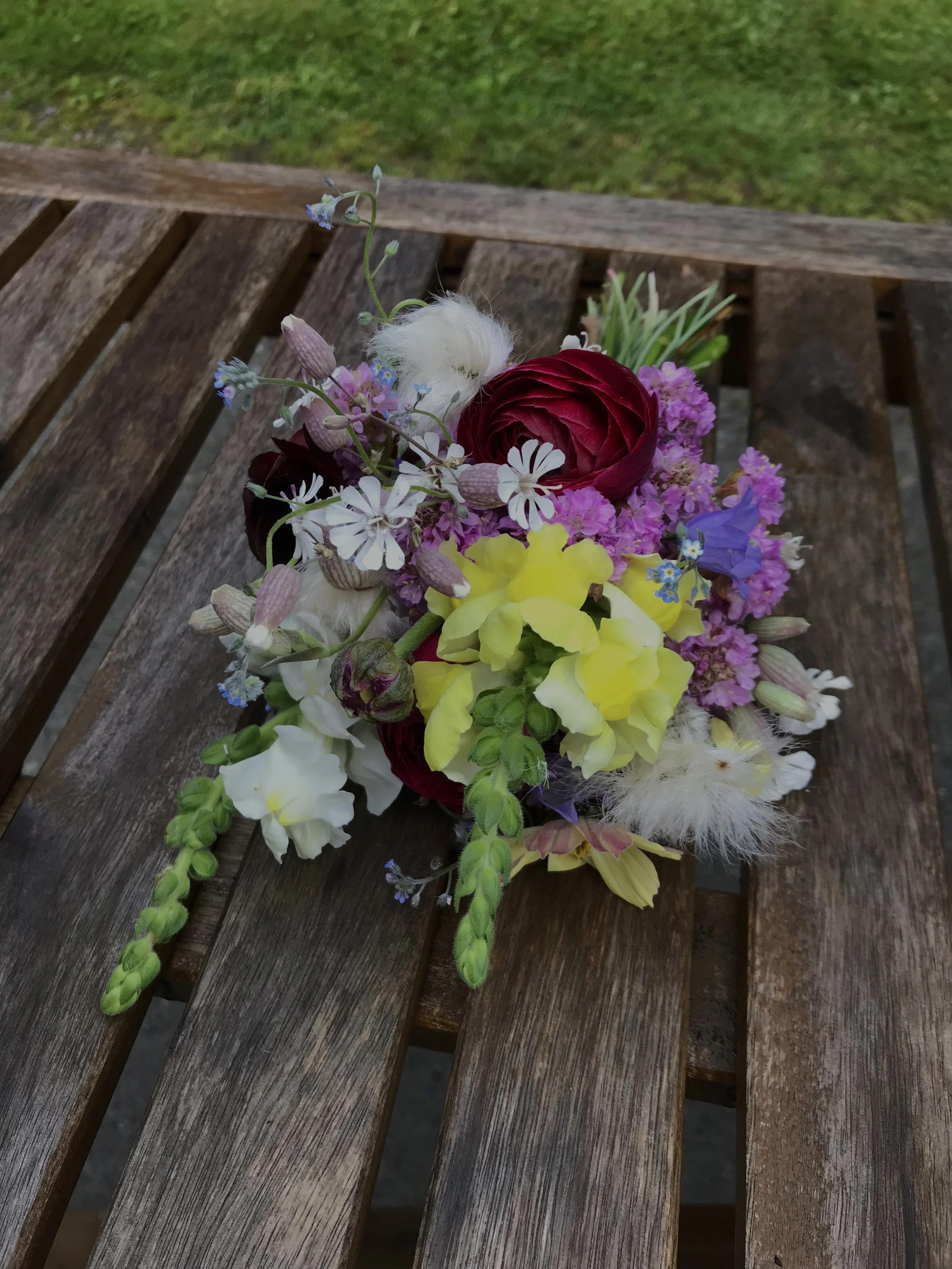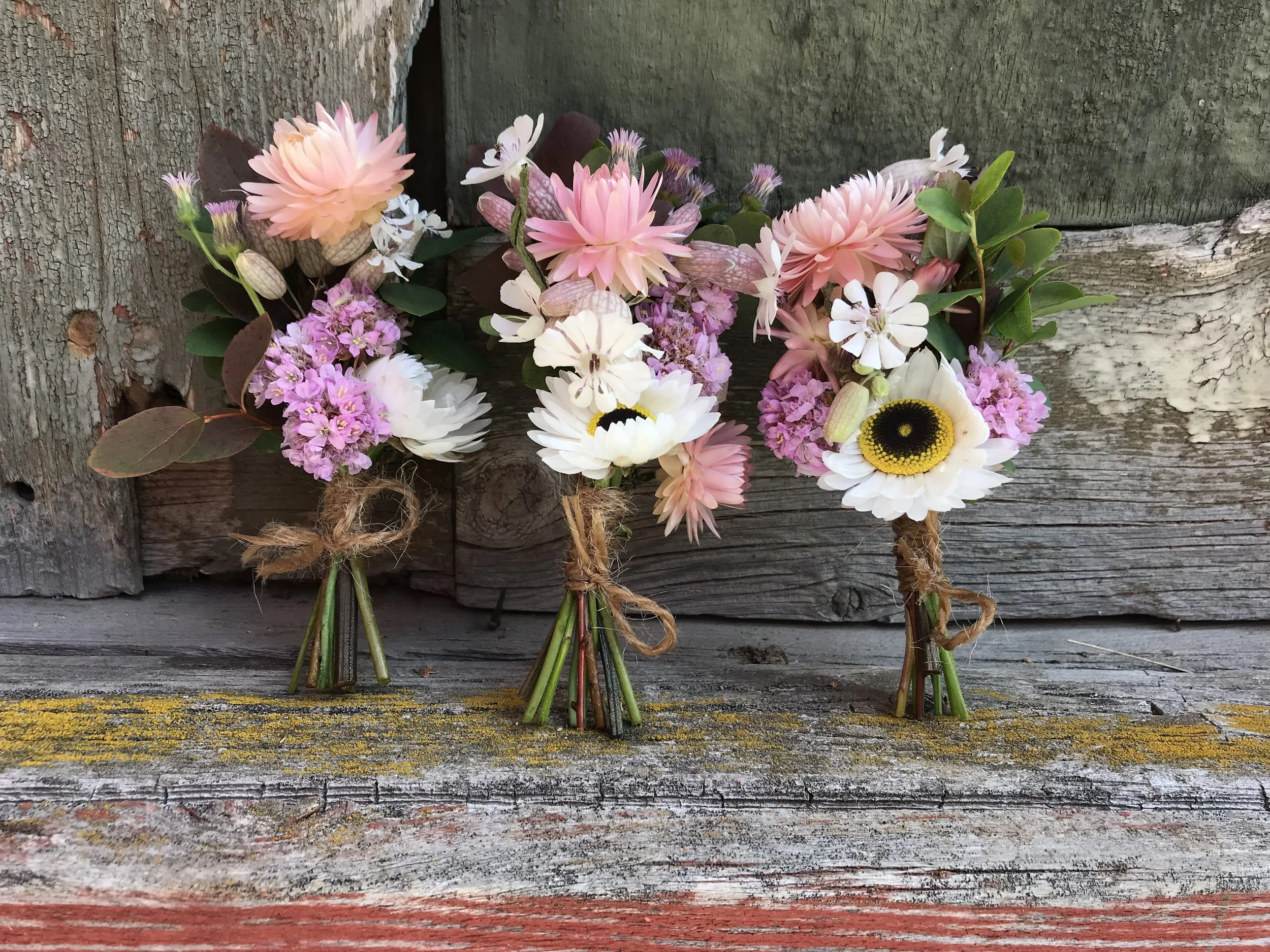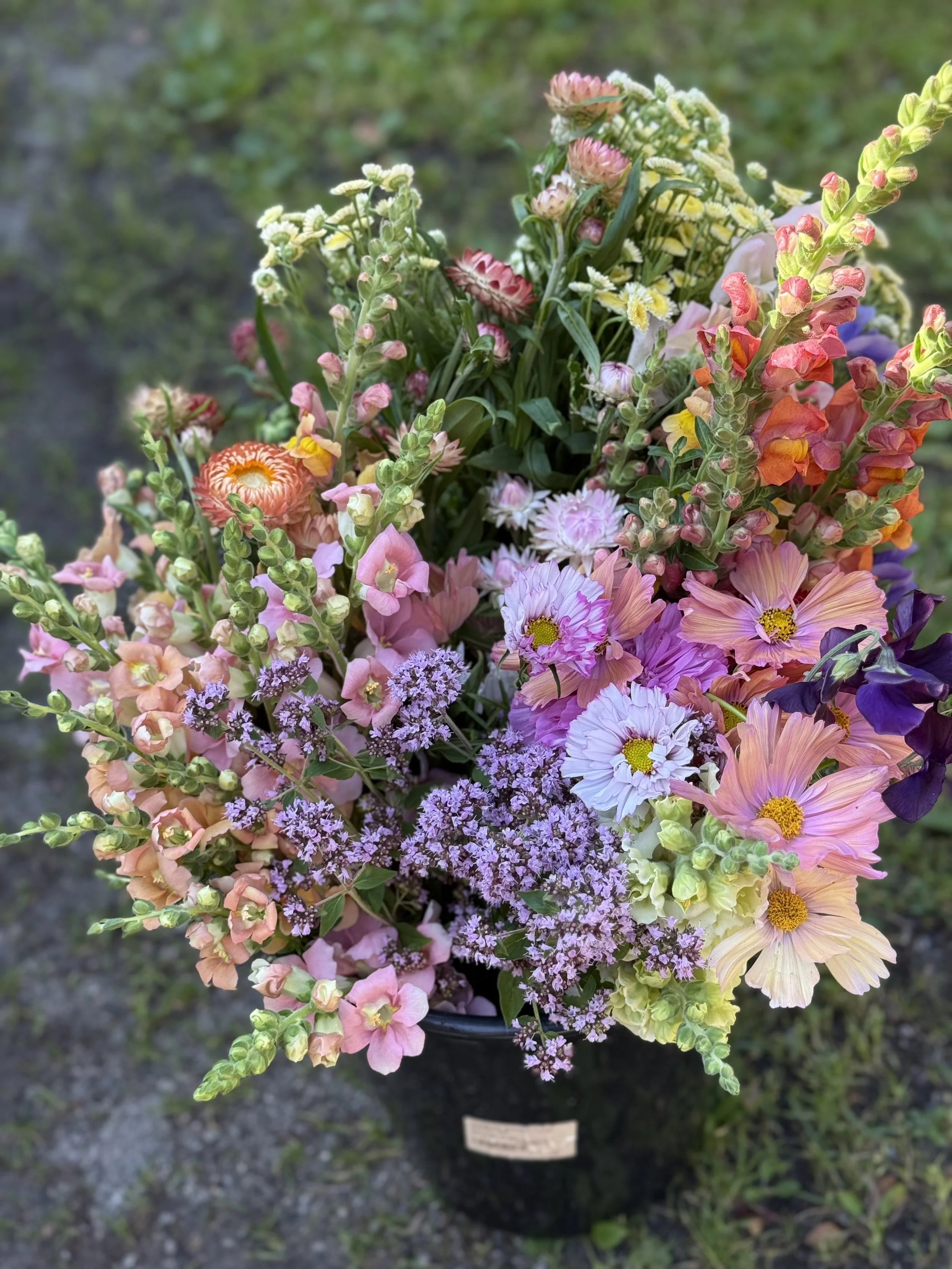 Vi tilbyr også blomsterbøtter fra august til midten av september, når åkeren virkelig bugner. En blomsterbøtte er fylt med flere typer blomster, perfekt til både buketter og dekorasjoner. For å få det beste resultatet, anbefaler jeg at dere bestiller både blomster og grønt til å fylle i mellom blomstene. Dette gir deg materiale som virkelig kan forvandle ditt arrangement. Alternativt kan du høste litt grønt fra naturen eller hagen din, og kombinere med våre blomster for en unik og personlig touch.